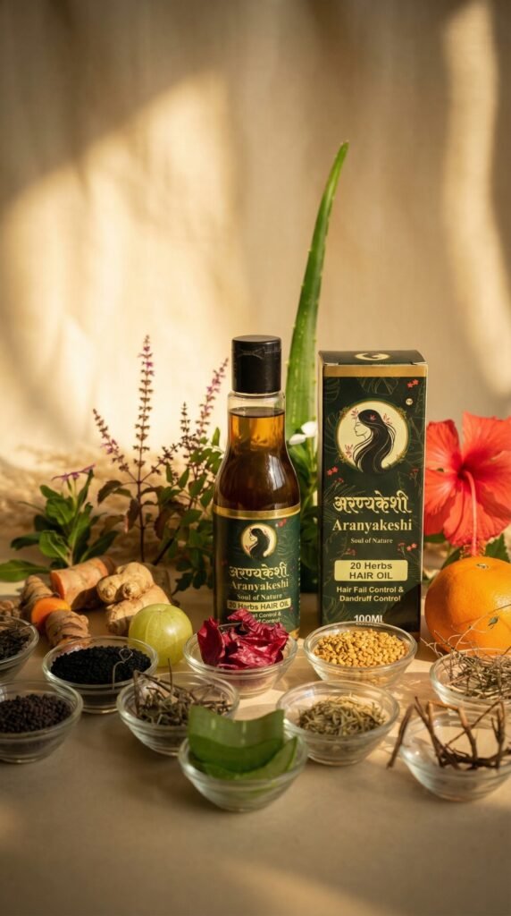 Our flagship product, Aranyakeshi Herbal Hair Oil, reflects this philosophy. Carefully crafted using 20+ powerful herbs infused in pure virgin coconut oil, the formulation is inspired by traditional Ayurvedic hair care practices known for strengthening hair roots, nourishing the scalp, and promoting healthier hair growth.